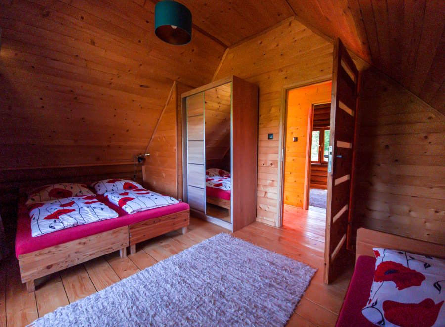 Każdy domek na piętrze ma 2 sypialnie. W każdej sypialni są 3 miejsca noclegowe.